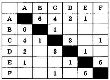 "Между населёнными пунктами А, В, С, D, Е, F построены дороги, протяжённость которых приведена в таблице. (Отсутствие числа в таблице означает, что прямой дороги между пунктами нет).