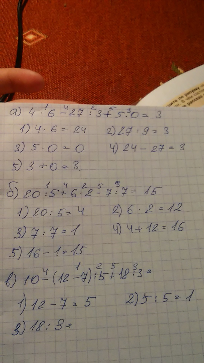 составь програму действий и вычисли: а) 4•6-27:3+5•0 б)20:5+6•2-7:7 в)10-(12-7):5+18:3 г)4•4:2+14:(18:9)