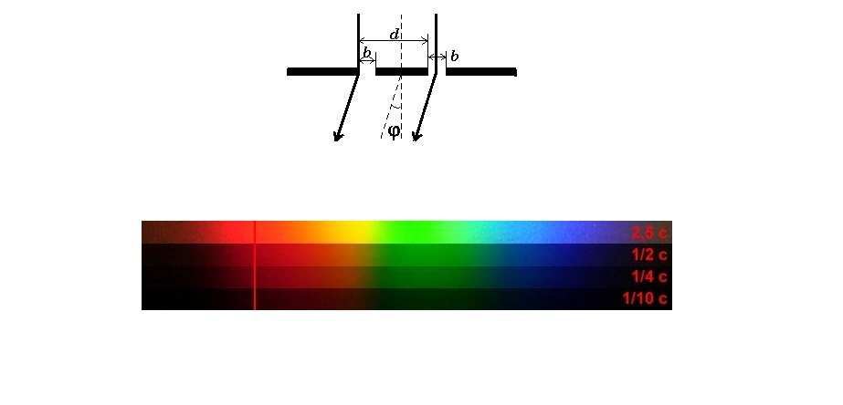 при попадании белого цвета на дифракционную решетку свет рассеивается с противоположной стороны . максимумы интерференции на дифракционной решетке будут наблюдаться при разности хода лучей равной целому числу длин волн. первый максимум будет у лучей с меньшей длиной волны. для света с большей длиной волны разность хода должна быть немного большей. таким образом на дисперсионной решетке красный цвет как более длинноволновый наблюдается при большем отклонении от оси луча чем например синий .