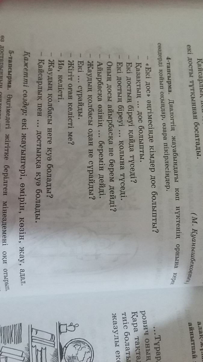 1)екы жауынгер 2)жау.3)омырын.4)козын.5)адал