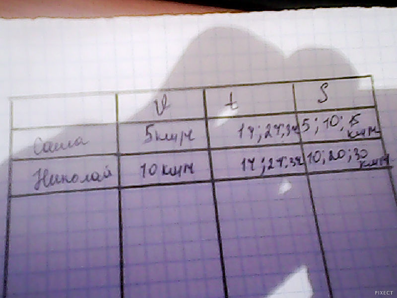 николай ехал на велосипеди со скоростью 10,км ч саша шел пешком со скоростью 5 км ч заполните таблицу вычеслив растояние преодоленное николаем и сашой 1ч 2ч 3ч