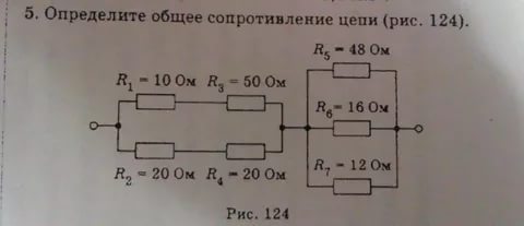 R13=60 Ом, R24=40 Омт. к. соединение последовательное; R1234=1/(1/R12+1/R23)=24 Ом - соединение параллельное; R567=1/(1/R5+1/R6+1/R7)= 6 Ом - параллельно; 3) И наконец, R1234 и R567 соединены последовательно, а значит R=R1234+R567=24+6=30 Ом