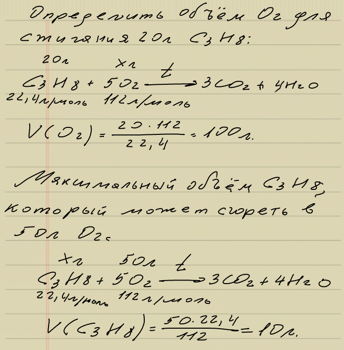 Определите объем кислорода, необходимый для сжигания 20 л пропана.