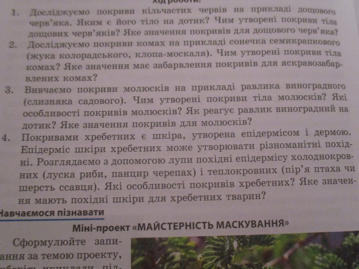 4)Покровом позвоночных является кожа, образованная эпидермисом и дермою.Епидермис кожи позвоночных может образовать различные похидни.Розглядаемо с помощью лупы производные эпидермиса хладнокровных (чешуя рыбы, панцирь черепах) и теплокровных (Перья птицы, или шерсть млекопитающего), которые особенности покровов позвоночных? Какое значение имеют производные кожи для позвоночных животных?