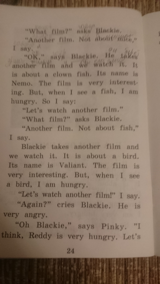 Хорошо. говорит Блеки. Он берет другой фильм и мы смотрим его. Он про рыбу клоуна. его зовут Немо. Фильм очень интересный. Но, когда я вижу рыбу, мне хочется есть. Поетому, я говорю: