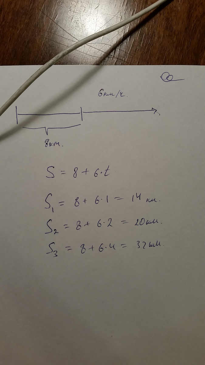 Турист отошёл от лагеря на 8 км и остановился отдохнуть. Затем он продолжил движение со скоростью 6 км/ч. 1)Задайте формулой зависимость расстояния s, на котором находится от лагеря турист, от времени t, которое отсчитывается после отдыха. 2) Найдите расстояние s, соответствующее значению времени t = 1; 2; 4.