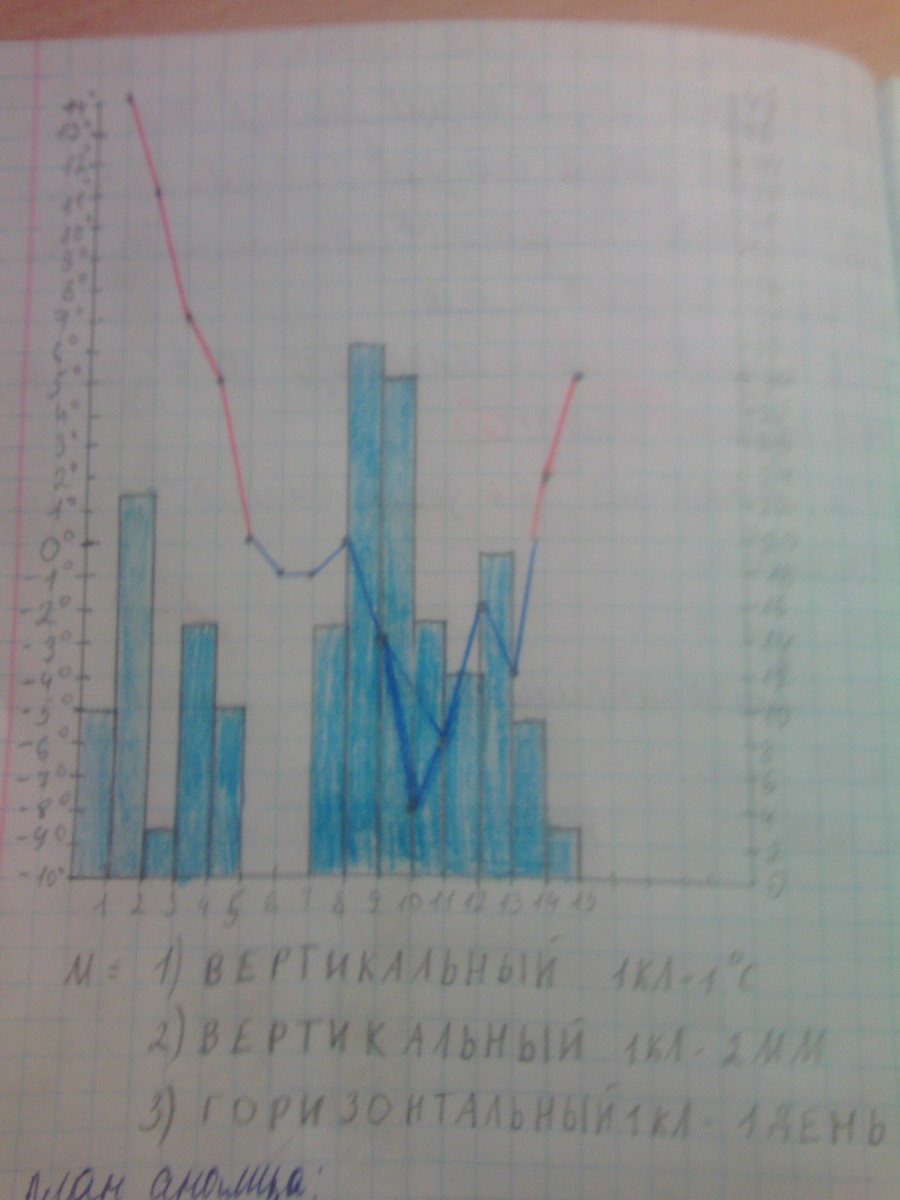 1)наибольшая температура в 1й день +14°с,наименьшая на 10й день -8°с, Средняя температура +5°с