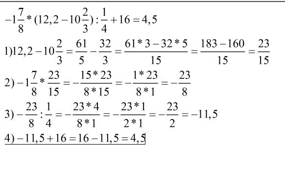 найдите значение выражения: минус одна целая семь восьмых умножить на в скобках (12,2 минус десять целых две третьи)скобка закрывается разделить на одну четвертую плюс шеснадцать