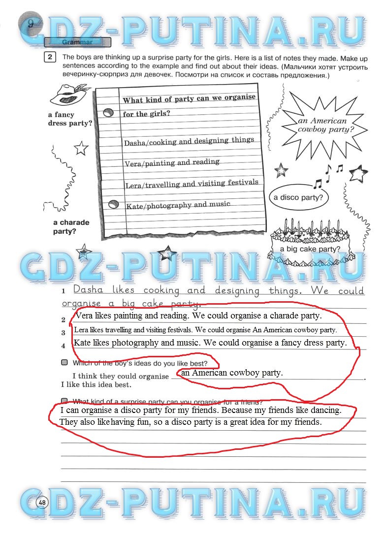 2. Лере нравятся путешествия и посещения спектаклей. Мы могли бы организовать вечеринку с американскими ковбоями (американских ковбоев)