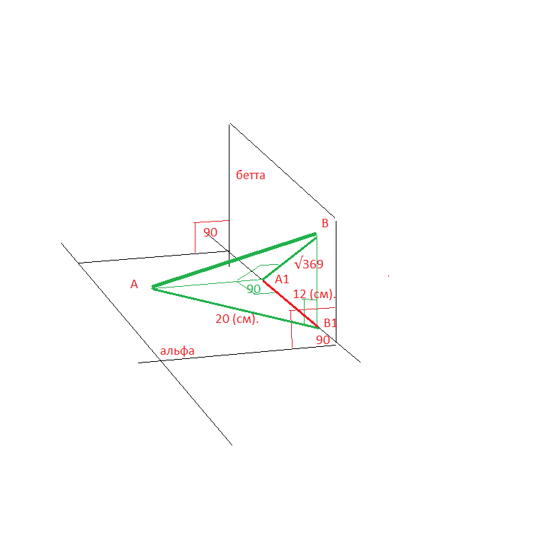 Концы отрезка лежат в двух взаимно перпендекулярных плоскостях. Проекции отрезка на каждую из плоскостей соответственно равны корень из 369 (см) и 20 (см). Росстояние между основаниями перпендекуляров, проведенных из концов отрезка до плоскостей, равно 12 (см). Найти длину данного отрезка.