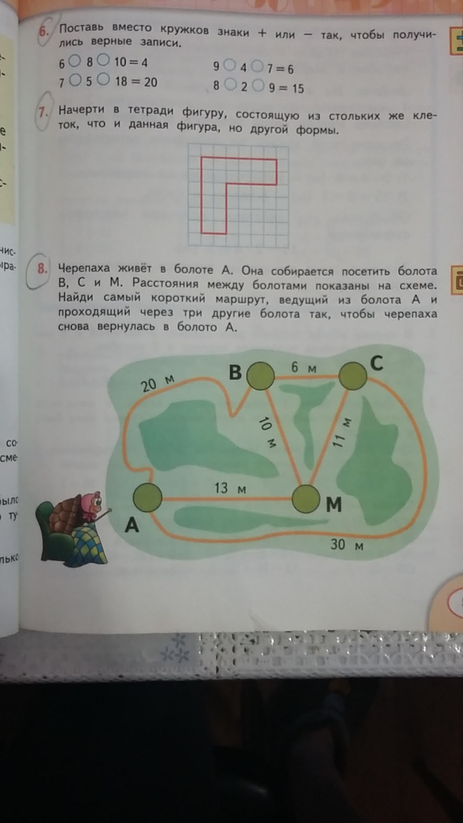 черепаха живет в болоте А.она собирается посетить болота В,С и М.расстояния между болотами показаны на схеме.найди самый короткий маршрут ведущий из болота А и проходящий через три другие болота так чтобы черепаха снова вернулась в болото А