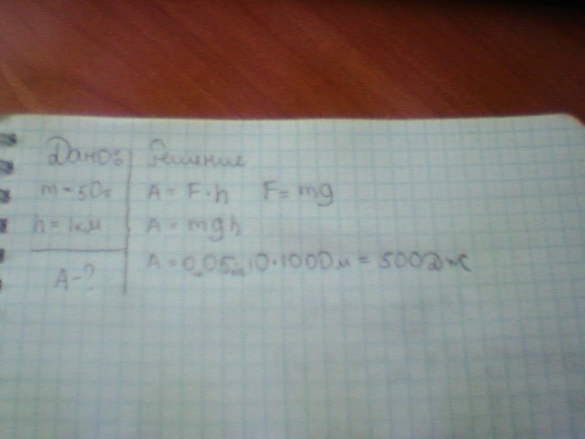 тело массой 50 г поднято на высоту 1 км Найдите механическую работу, совершенную силой тяжести при подьеме тела