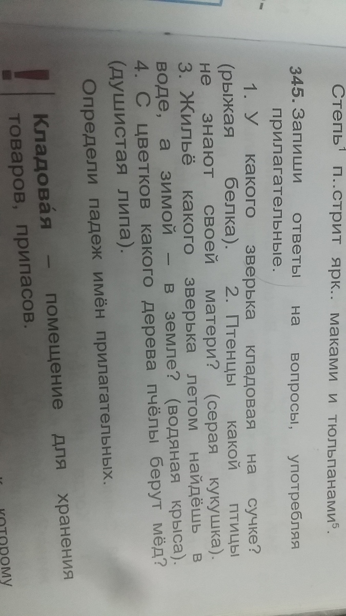 У  рыжей (Родит. падеж) белки кладовая на сучке. Птенцы серой (Род. падеж) кукушки не знают своей матери. Жильё водяной (Род.падеж) крысы летом найдёшь в воде, а зимой -в земле. С цветков душистой (Род. падеж) липы пчёлы берут мёд.