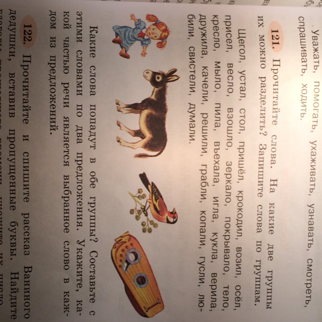 щегол, стол, крокодил, осёл, весло, зеркало, тело, кресло, мыло, игла, кукла, качели, грабли, гусли