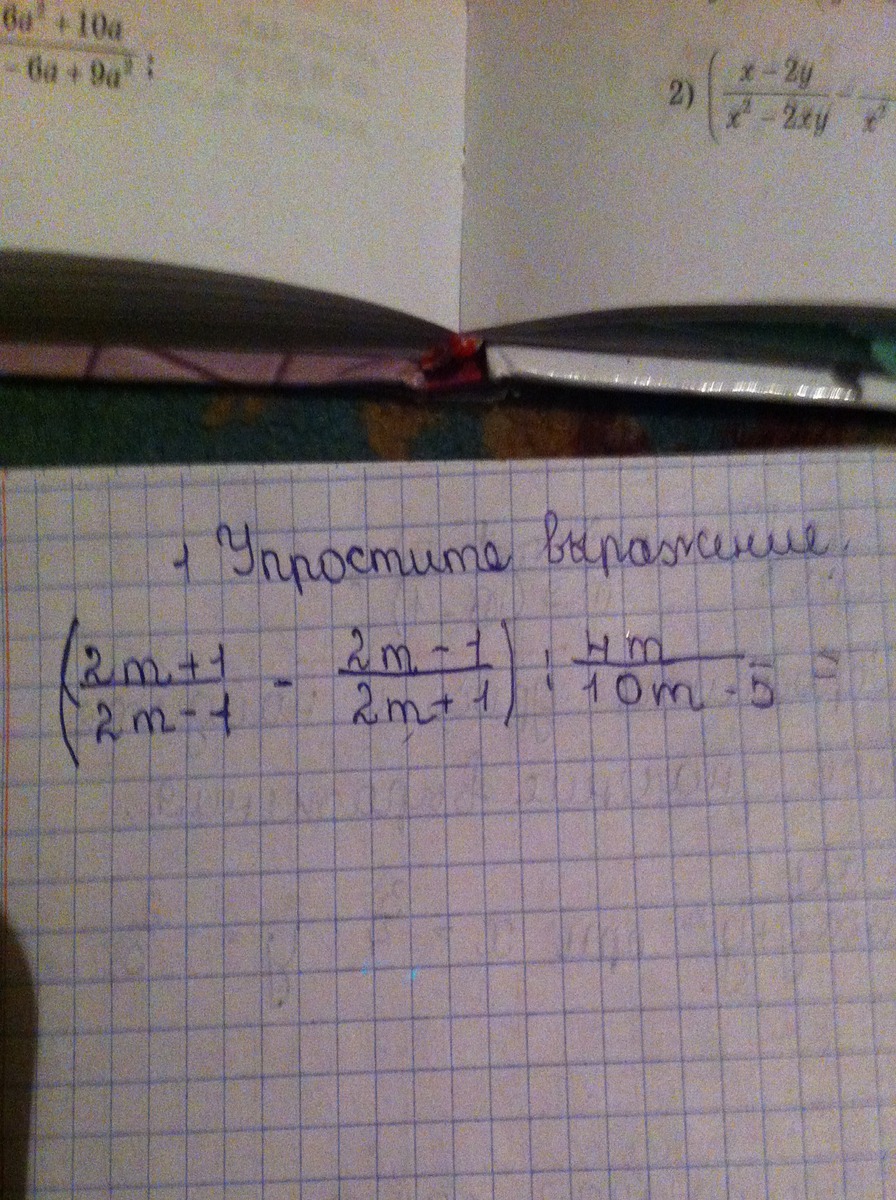 в скобках считаем: =числитель (2m+1)(2m+1)-(2m-1)(2m-1)/ знаменатель: (2m)²-1²=числитель: 4m²+2m+2m+1-4m²+2m+2m-1/знаменатель: (2m-1)(2m+1)=числ: 8m/знам:(2m-1)(2m+1),теперь выполняем деление. 8m/(2m-1)(2m+1) :4m/10m-5=числитель: 8m×5(2m-1)/знамен:(2m-1)(2m+1)×4m=числитель: 10m/ знамен: (2m+1)