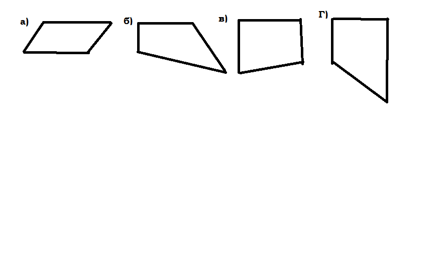 начерти четырехугольник, который: а) не имеет ни одного пряиого угла; б) имеет только один прямой угол; в) имеет два прямых угла; г) имеет три прямых угла.