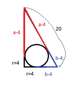 Чесу равна площадь прямоугольного треугольника если его гипотенуза равна 20 смс , а радиус вписанной в этот треугольник окружности 4см?