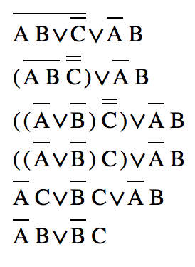 Используем закон де-Моргана (дважды), закон двойного отрицания и закон поглощения. Получим: