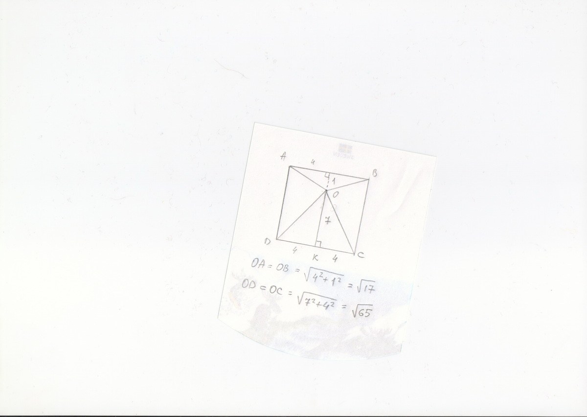 Помогите пожалуйста. Нужно на завтра.....Точка О-центр квадрата, длина стороны которого равна 8 см., отрезок ОК перпендикулярен плоскости квадрата. Вычислите растояние от точки К до вершин квадрата, если ОК=7 см.