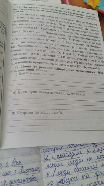 1.Наближалося тепле,ясне,сонячне лiто.2.Луки були немов застеленi зеленим килимом.3.Ударила по водi золотиста риба.