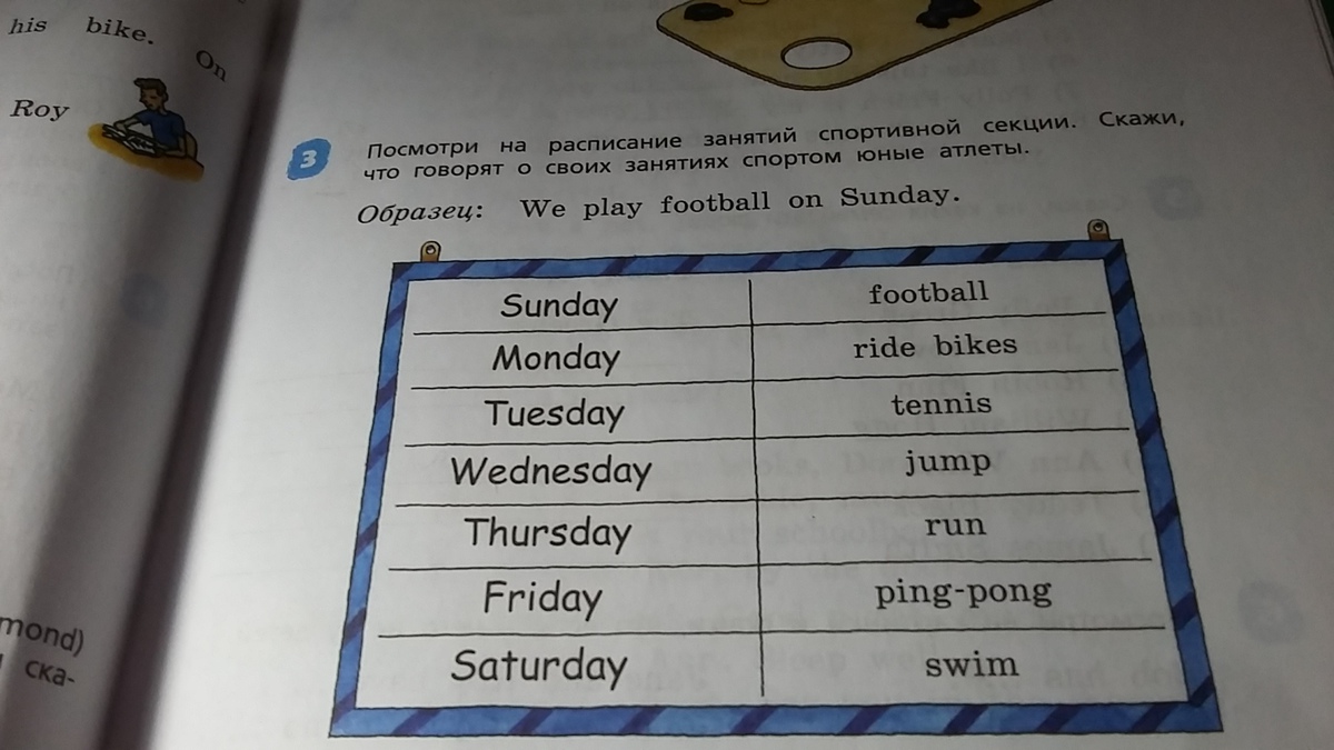We ride bikes on Monday, We play tennis on Tuesday. We jump on wednesday. We run on Thursday. We play pin-pong on Friday. We swim on Saturday