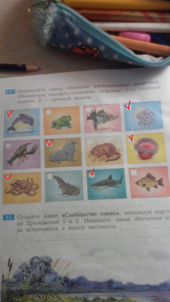 Под галочкой - обитатели солёного водоёма,остальное -пресного .