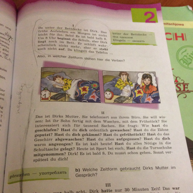 Там под одеялом Дирк. Рано вставать по утрам -- нелегко для него. Посмотрите! Уже скоро половина 8. А в 8 утра уже начинаются уроки,но Дирк ещё лежит в кровати. Наверное он уже не спит,но и не встаёт. Тут звонит телефон..
