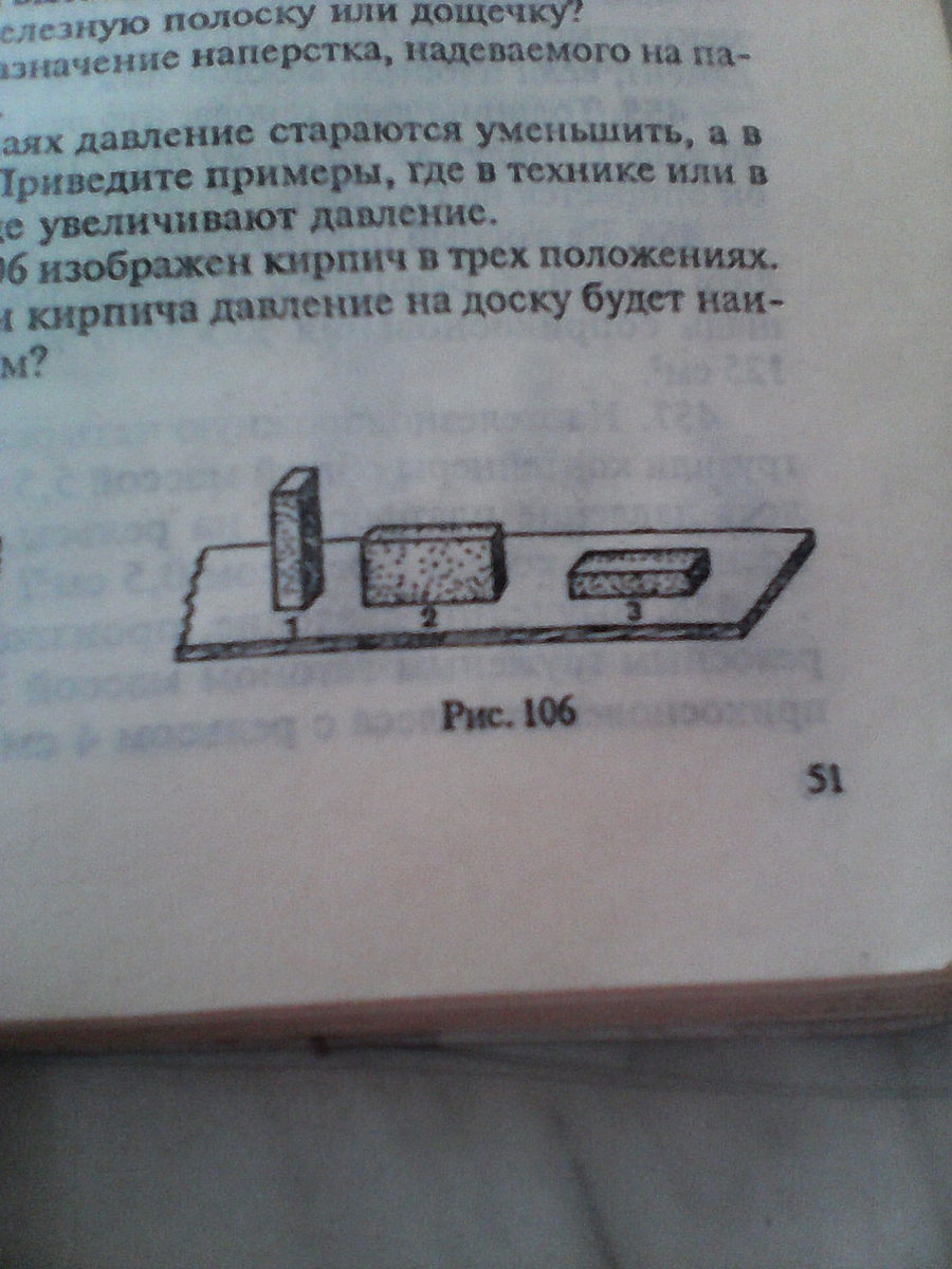 на рисунке 106 изображен кирпич в трех положениях при каком положении кирпича давление на доску будет наименьшим, наибольшим?