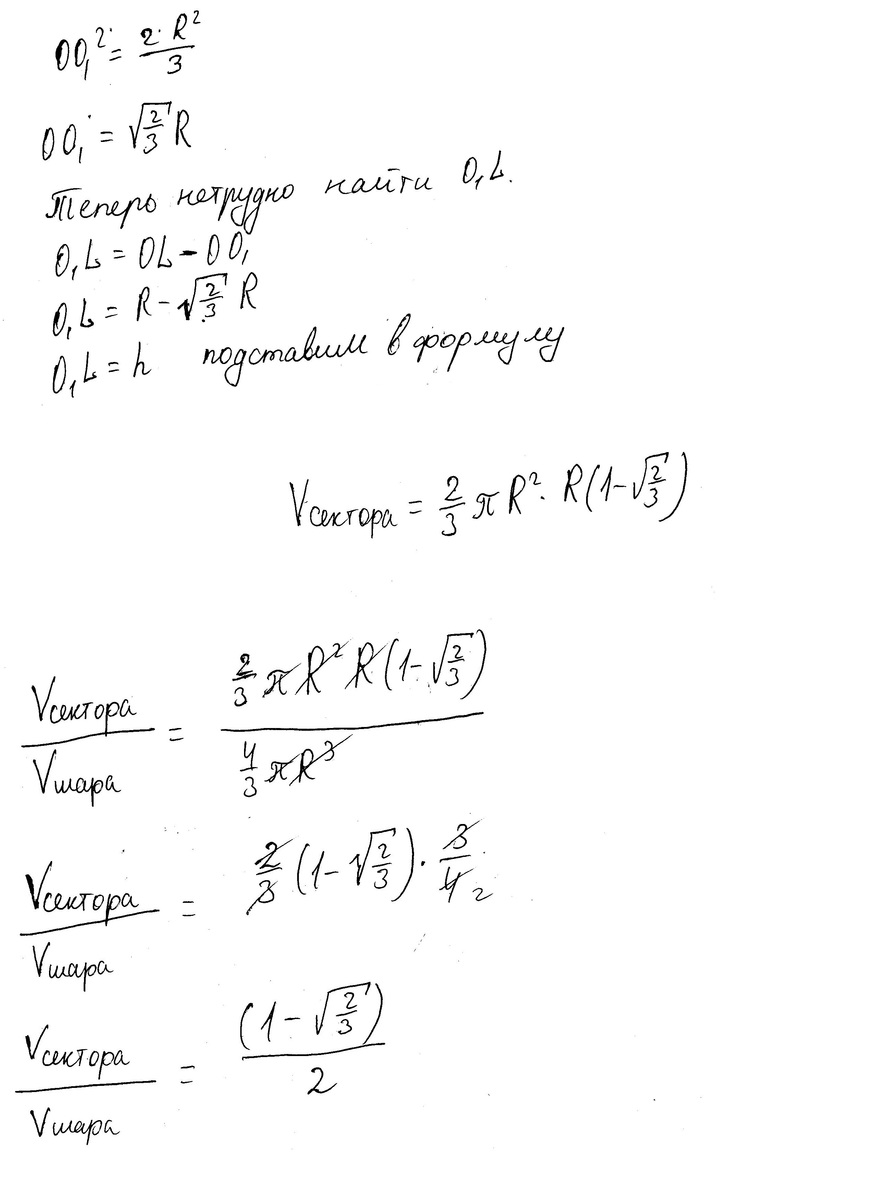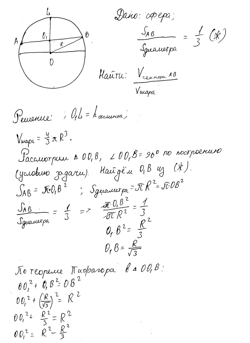 Найдите отношение объема шара и объема его сектора, если площадь осевого сечения сектора равна 13 площади большого круга шара.