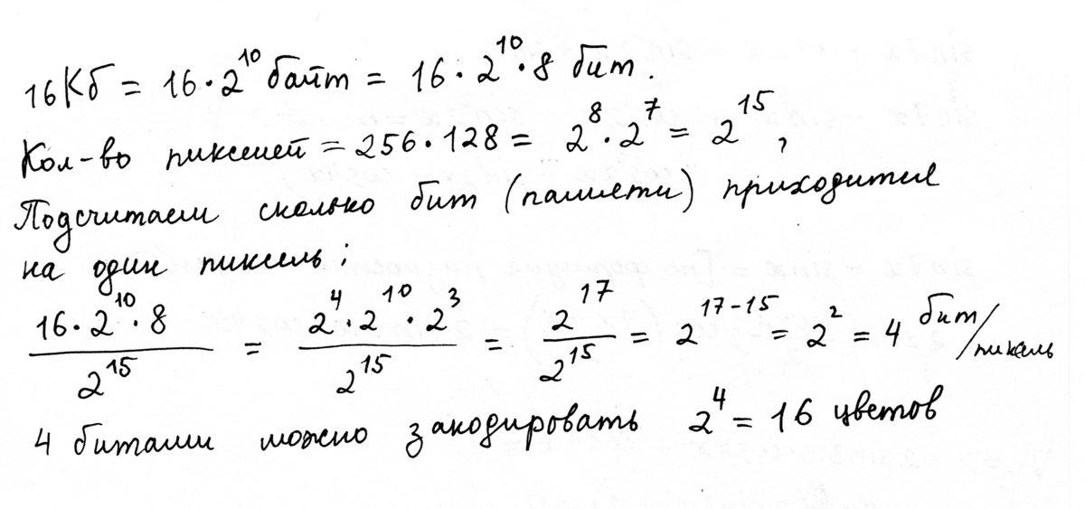 несжатое растровое изображение размером 256*128 пикселей занимает 16 Кб памяти.Каково максимальное возможное число цветов в палитре