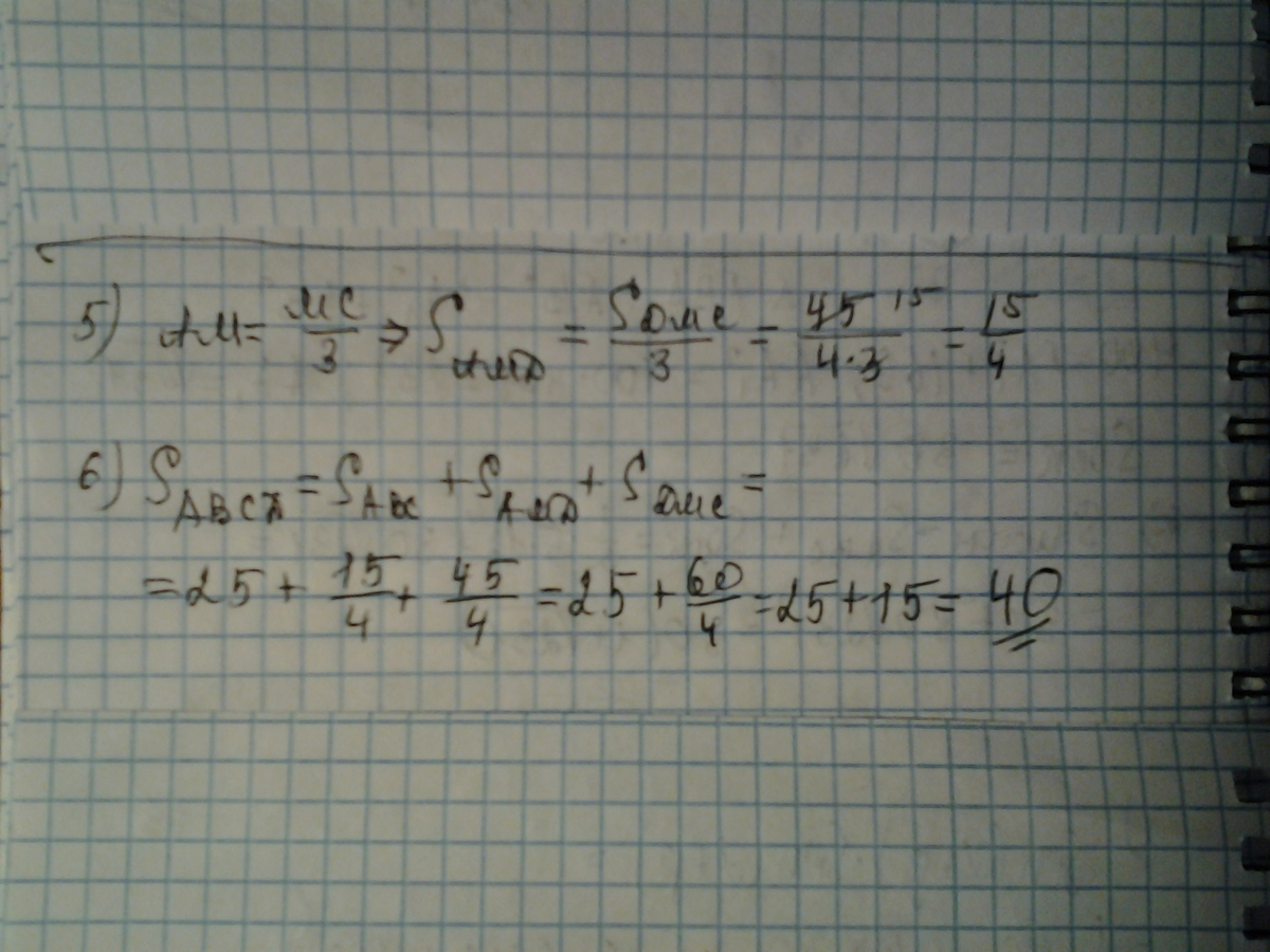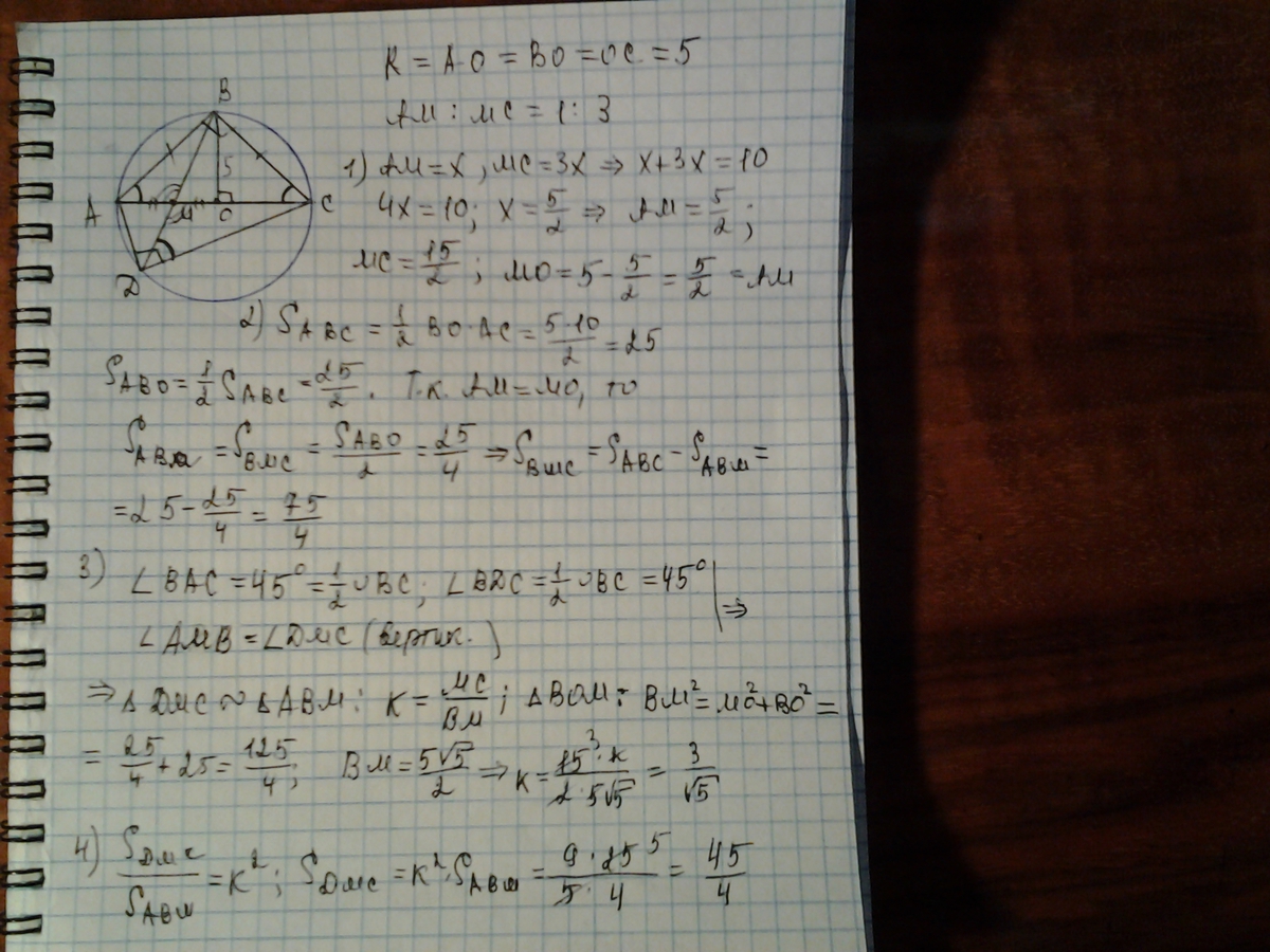 Равнобедренный прямоугольный треугольник АВС с прямым углом В вписан в окружность радиуса 5. На отрезке АС выбрана точка М так что АМ:МС=1:3. Прямая ВМ вторично пересекает окружность в точке Д. Найдите площадь четырёхугольника АВСД.