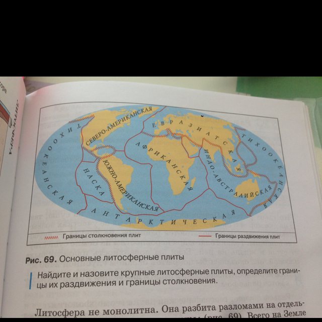 Используя рисунок 69 и физическую карту полушарий назовите литосферные плиты располагающийся под Атлантическим океаном и под Индийским океаном