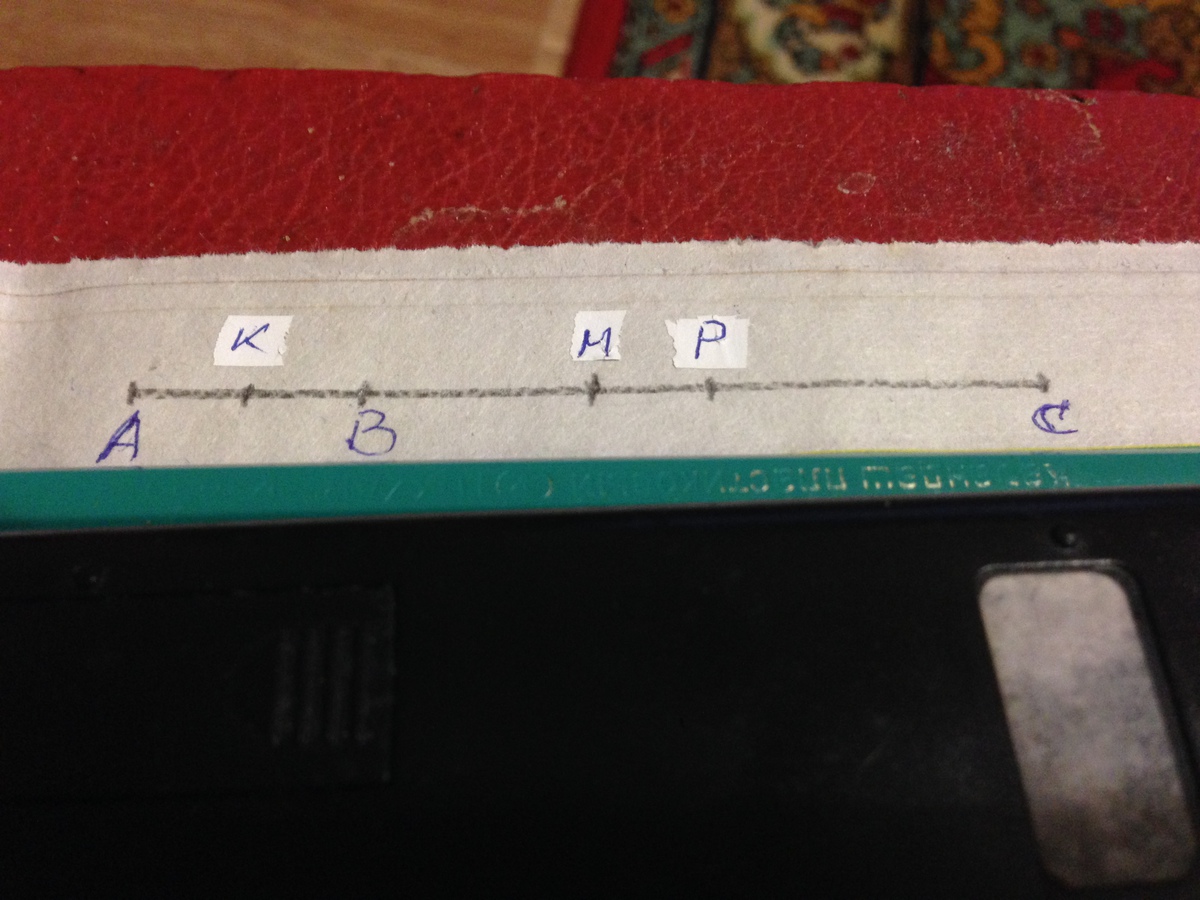 Точки K P и M являются серединами отрезков AB,BC и AC. в каком отношении точка M делит отрезок KP,если AB=1 BC=3 AC=4 помогите! пожалуйста!