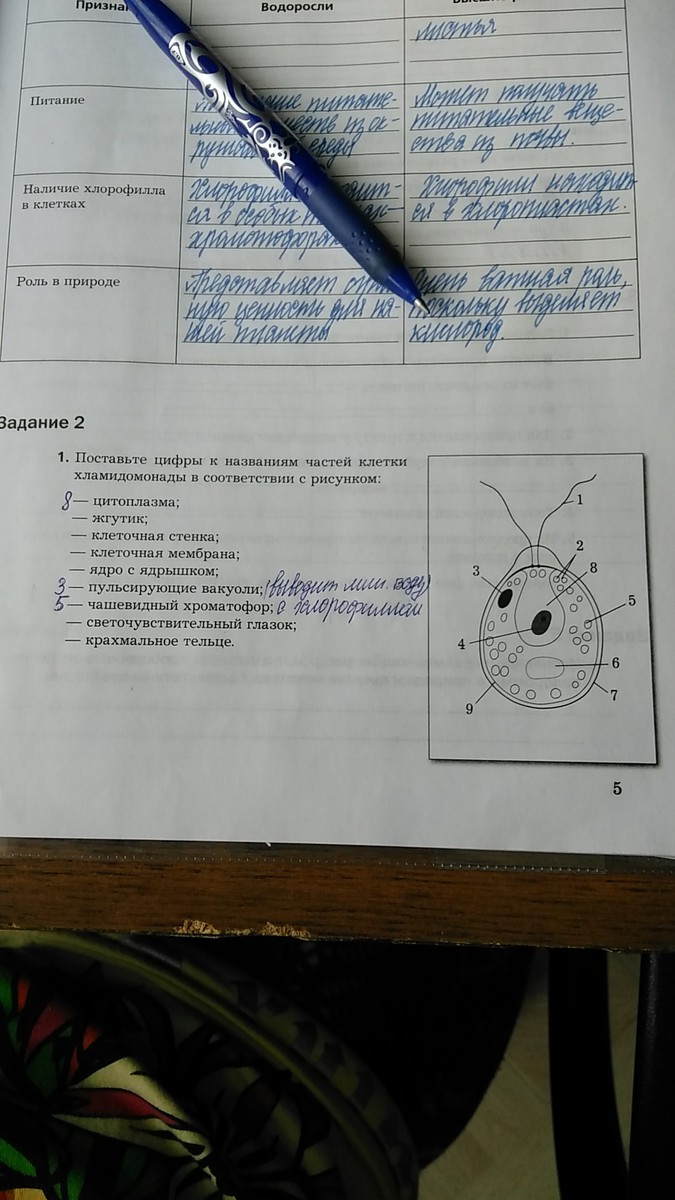 Поставьте цифры к названиям частей клетки хламидомонады в соответствии с рисунком.