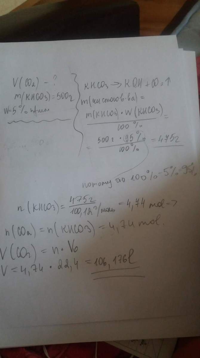Какой объём углекислого газа выделится при разложении 500 г гидрокарбоната калия, содержащего 5% примесей?