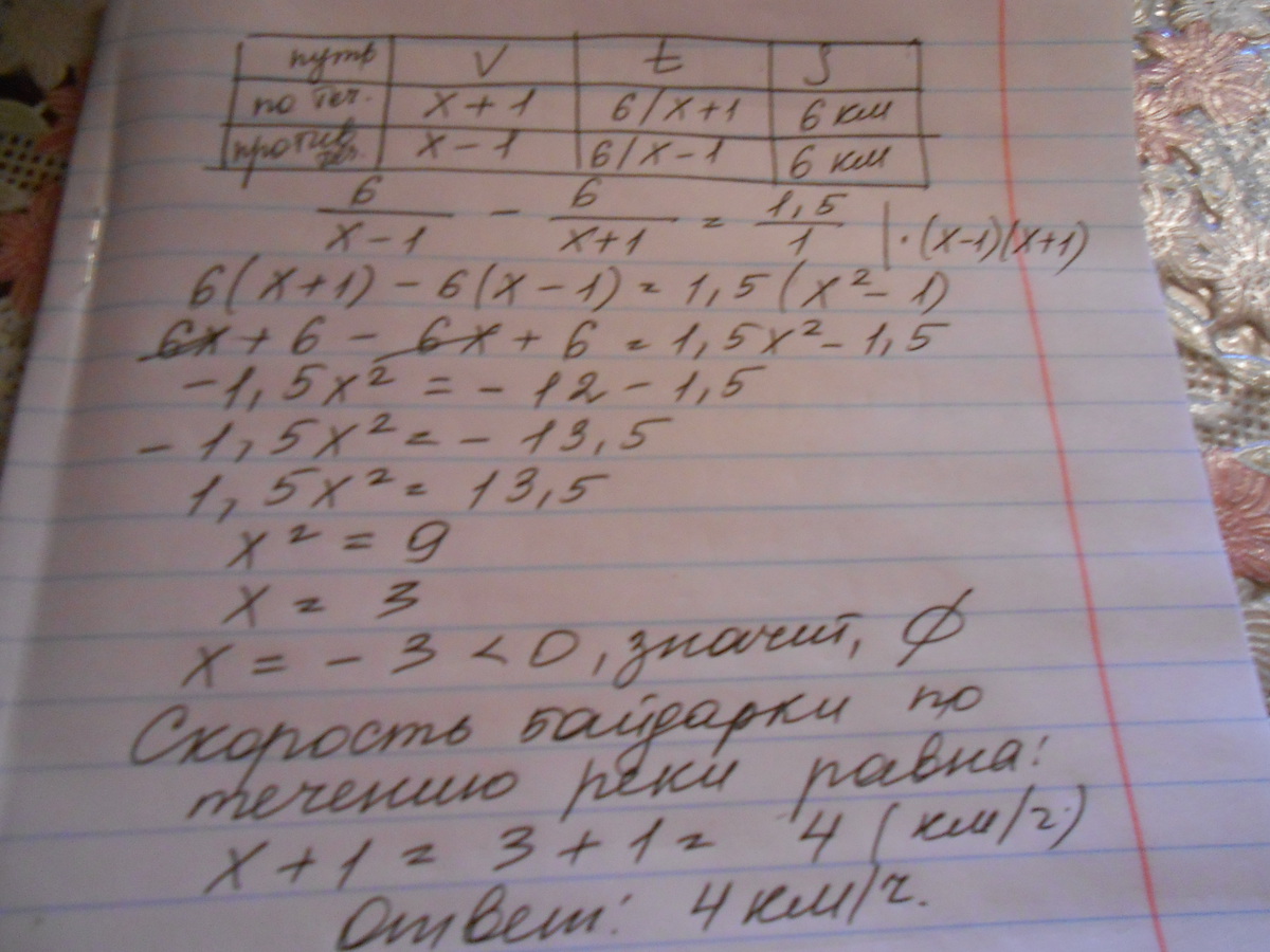 Туристы проплыли на байдарке 6 км по течению реки и вернулись обратно, затратив на обратный путь на 1,5 часа больше. Какова скорость байдарки по течению, если скорость течения реки равна 1 км/ч? Составьте квадратное уравнение и решите его.