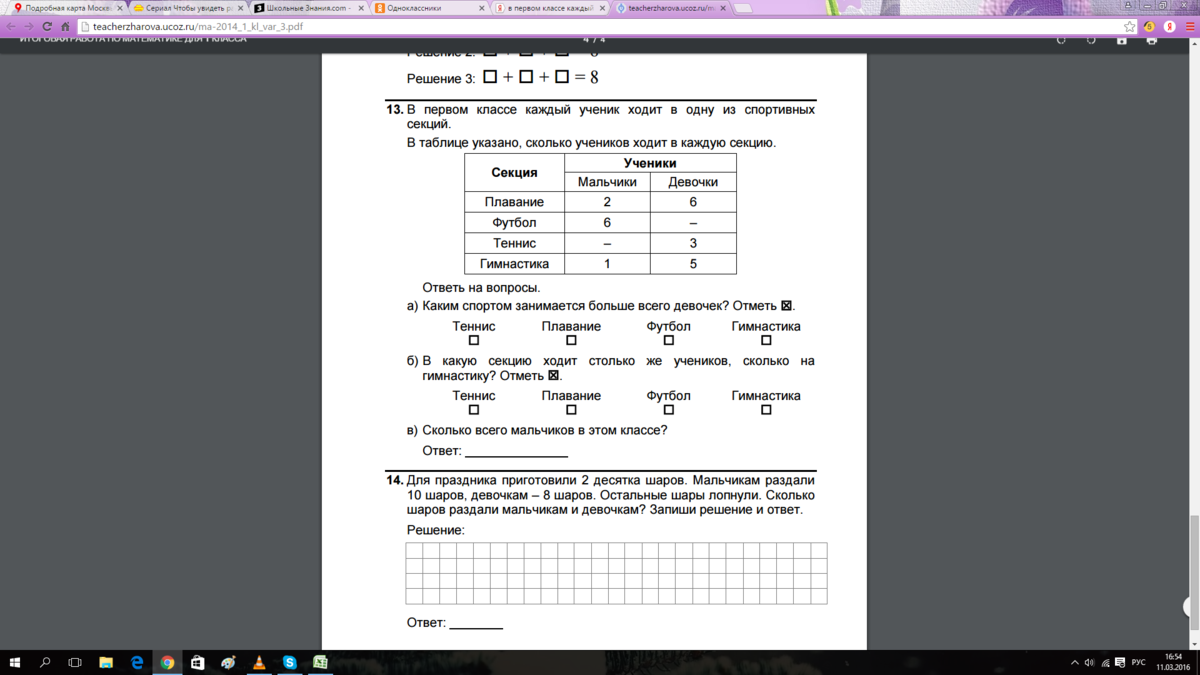 больше всего девочек занимается плаванием, столько же учеников ходит на футбол, всего 14 мальчиков