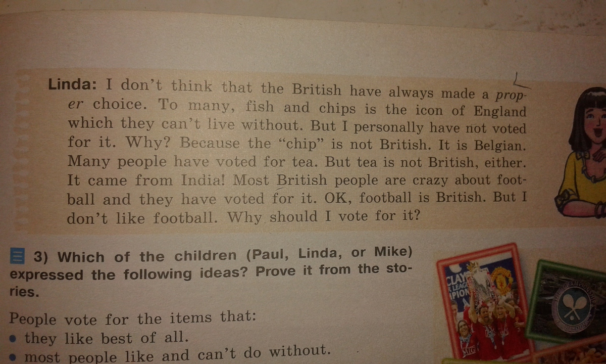 Линда: Я не думаю, что англичане всегда делали выбор опоры эр. Для многих, рыба и чипсы является икона Англии, которую они не могут жить без Но я лично не голосовал за я L. Почему? Поскольку чип "не британцы. Это бельгийский Многие люди голосовали за чай. Но чай не англичане, либо. Он пришел из Индии! Большинство британских люди без ума от ноги мяч, и они за него проголосовали, Великобритания, футбол Британский. Но я не люблю футбол. Почему я должен голосовать за него