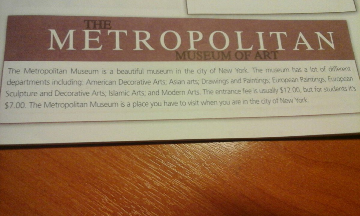 Музей метрополитена это красивый музей в нью йорке. Музей содержит много департаментов включая: американское декоративное искуство, азиатское исскуство, Рисунки и Картины, европейские картины, европейские скульптуры и декоративное искуство, исламское искусство, и Современное искусство. Вход обычно стоит 12$ но для студентов - 7$ Музей метрополитена это место которое вы должны посетить если посещаете нью йорк.
