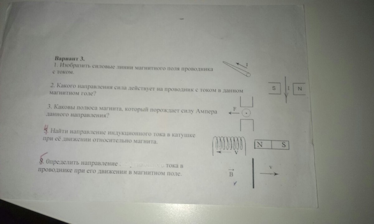 5) Плохо видно, куда направлен вектор В. Если за плоскость рисунка (крестик), то линии магнитной индукции входят в ладонь левой руки, движение проводника совпадает с отогнутым на 90° большим пальцем, тогда сила тока совпадает по направлению вытянутых 4-х пальцев левой руки, т.е. вниз.