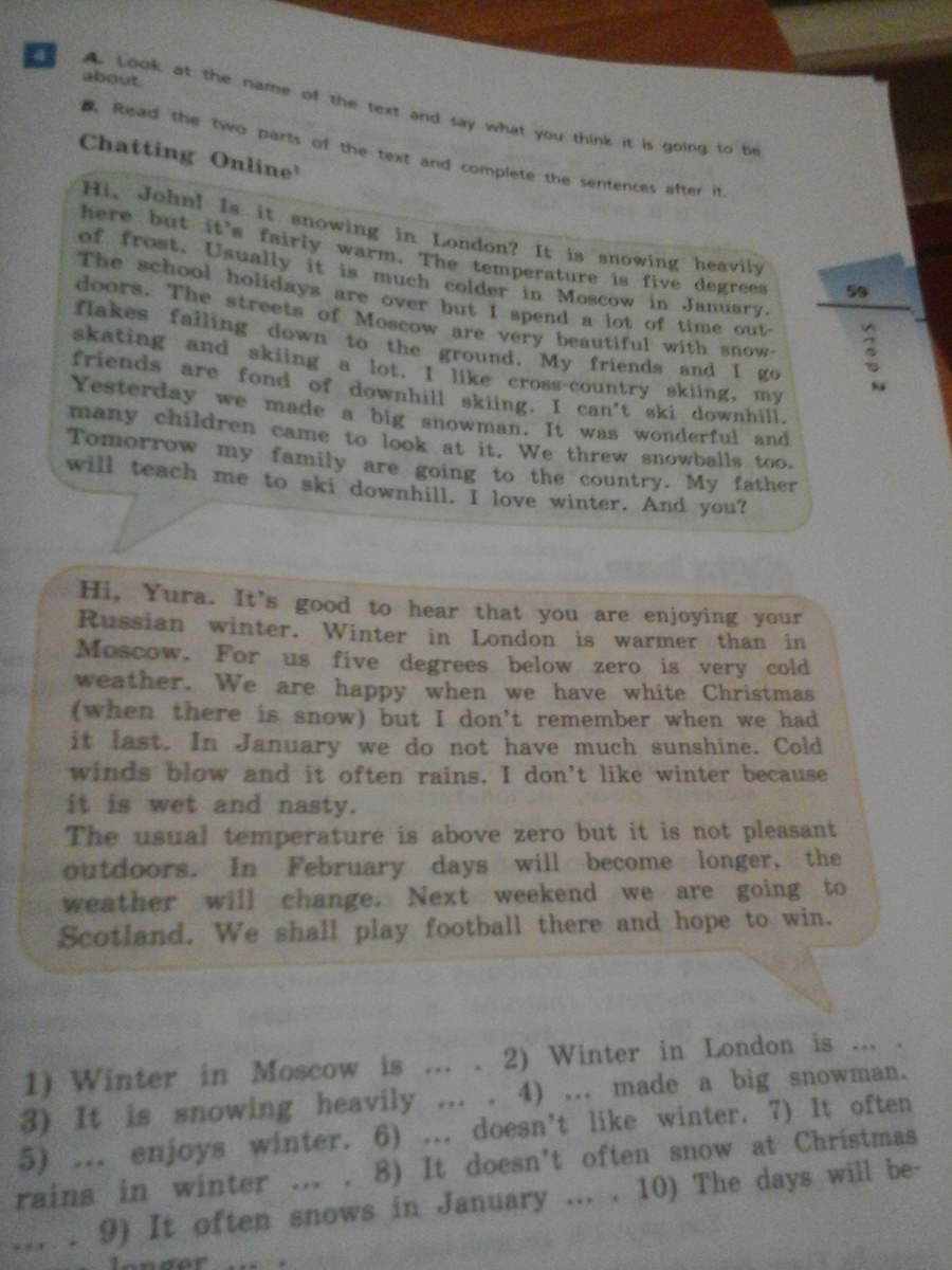 Winter in Moscow is fairly warm but it's snowing heavily. I spend a lot of time outdoor with my friends skating and skiing. We made a big snowman. Also we threw snowballs. I love winter. And you?