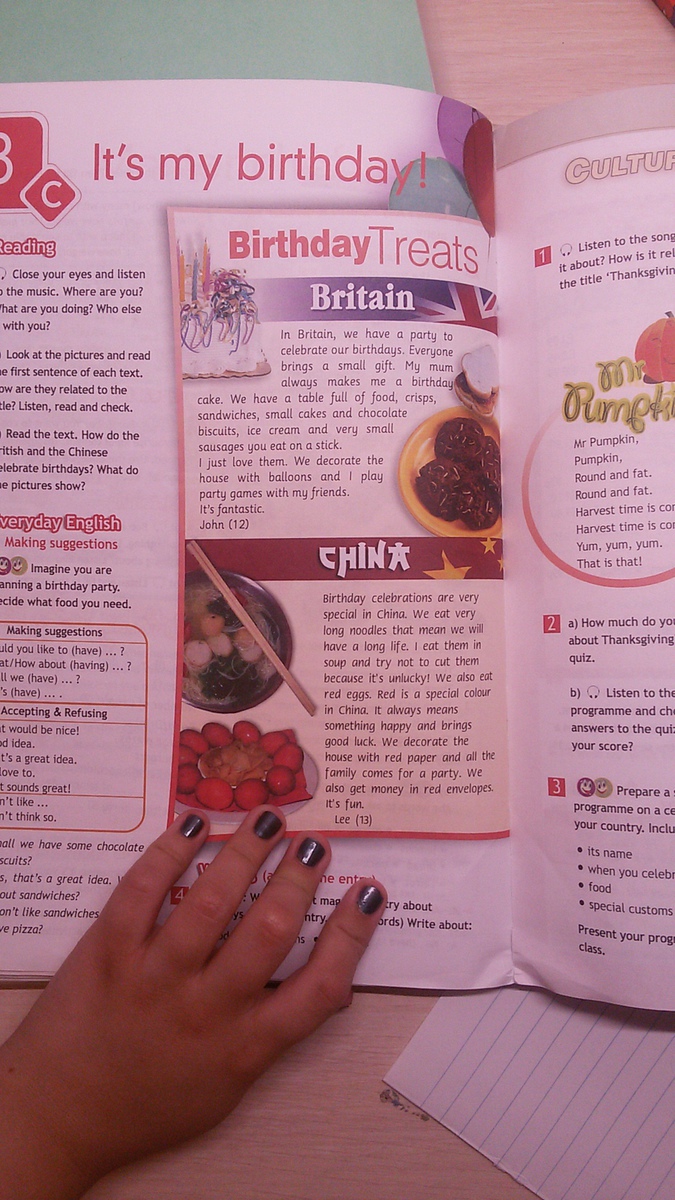 День рождения очень важен в Китае. Мы едим очень длинную лапшу и это значит что у нас будет долгая жизнь. Я ем ее из супа и стараюсь чтобы лапша не оборвалась. Это к невезению! Также мы едим красные яйца. Красный цвет в Китае особенный. Это всегда означает счастье и приносит удачу. Мы украшаем дом красной бумагой и вся семья приходит на праздник. Также мы кладем деньги в красные конверты. Это весело! Ли