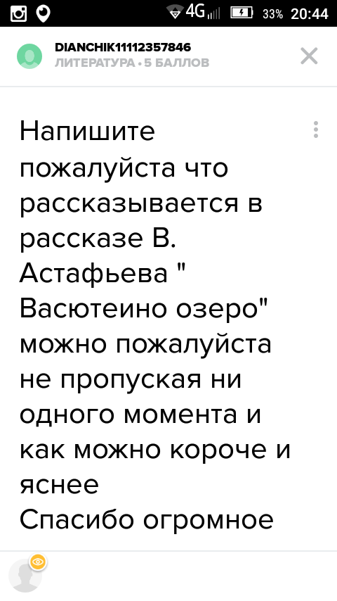 тема рассказа: выдержка, самообладание и мужество подростка Содержание: Сибирь. Поздняя осень. Мальчик Вася отправился в тайгу за кедровыми орехами и заблудился. Тайга не шутка, конечно, взрослому и то страшно, а тут ребенок. Не растерявшись, Васятка стал вспоминать всё, что хоть когда-то слышал от рыбаков о том, какие приметы могут помочь ему выйти из глухой тайги, он проявил недюжинную мудрость и мужество, он продержался в тайге долгих пять дней, добывая себе пищу, охотясь, не падал духом. На пятый день он вышел к неизвестному озеру, где было очень много рыб и по его течению вышел к Енисею, где его и нашли друзья отца. Озеро, которое нашел мальчик, назвали в его честь – Васюткиным озером. Хорошее произведение, много красивых моментов описания природы, интересный сюжет.