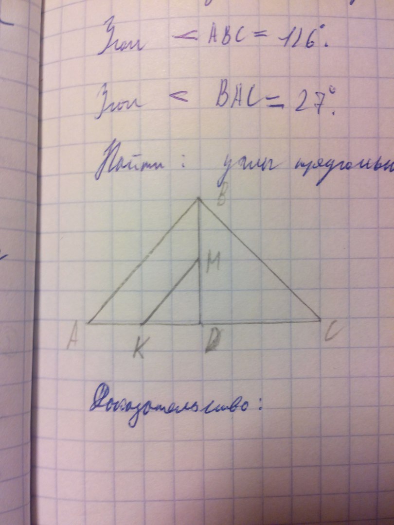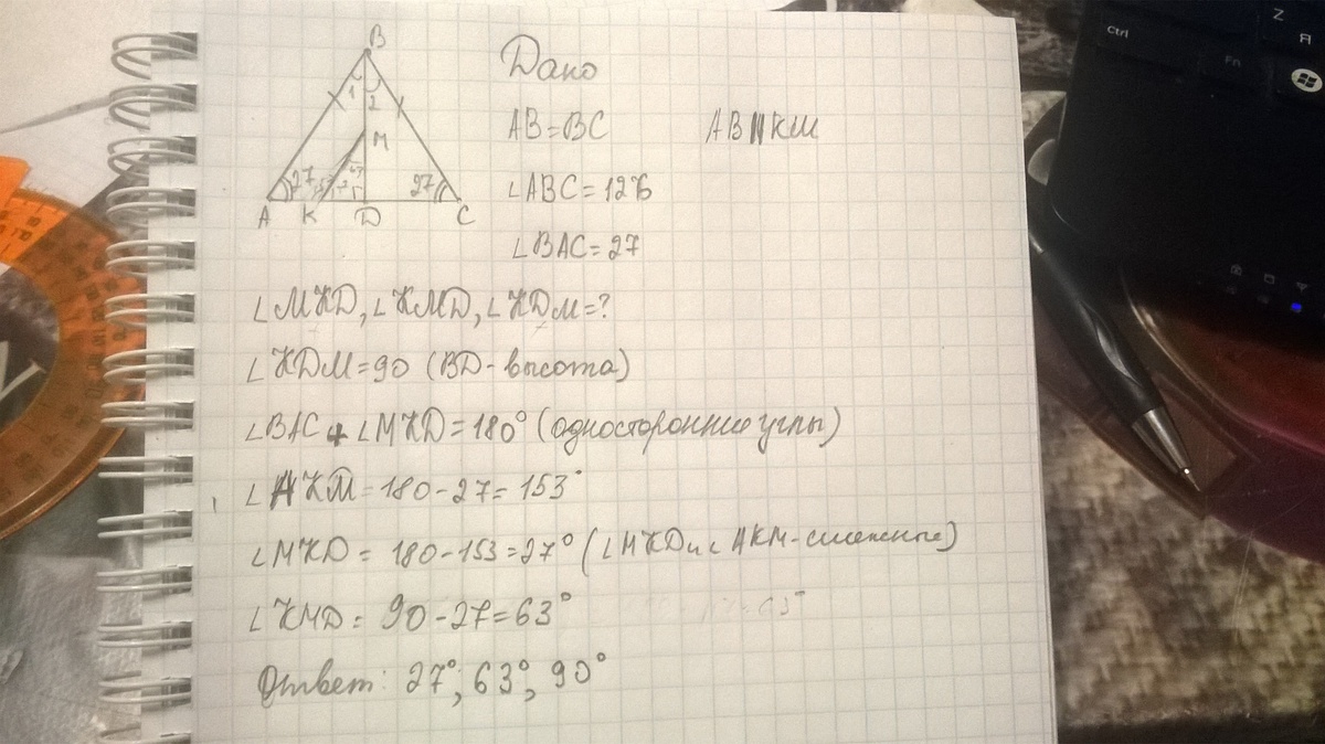 BD-является не только биссектрисой, а также высотой т.к треугольник равнобедренный,значит угол MDK=90 Угол KMD можно найти 2-мя способами: