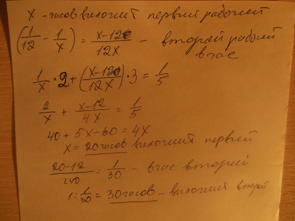 Двое рабочих,работая вместе,могут выложить плиткой дорожку вокруг фонтана за 12 ч.Если первый рабочий будет работать только 2ч,а второй - 3ч,то плиткой будет уложена только пятая часть площади дорожки.За какое время может выложить плиткой всю площадь дорожки каждый рабочий,работая отдельно?