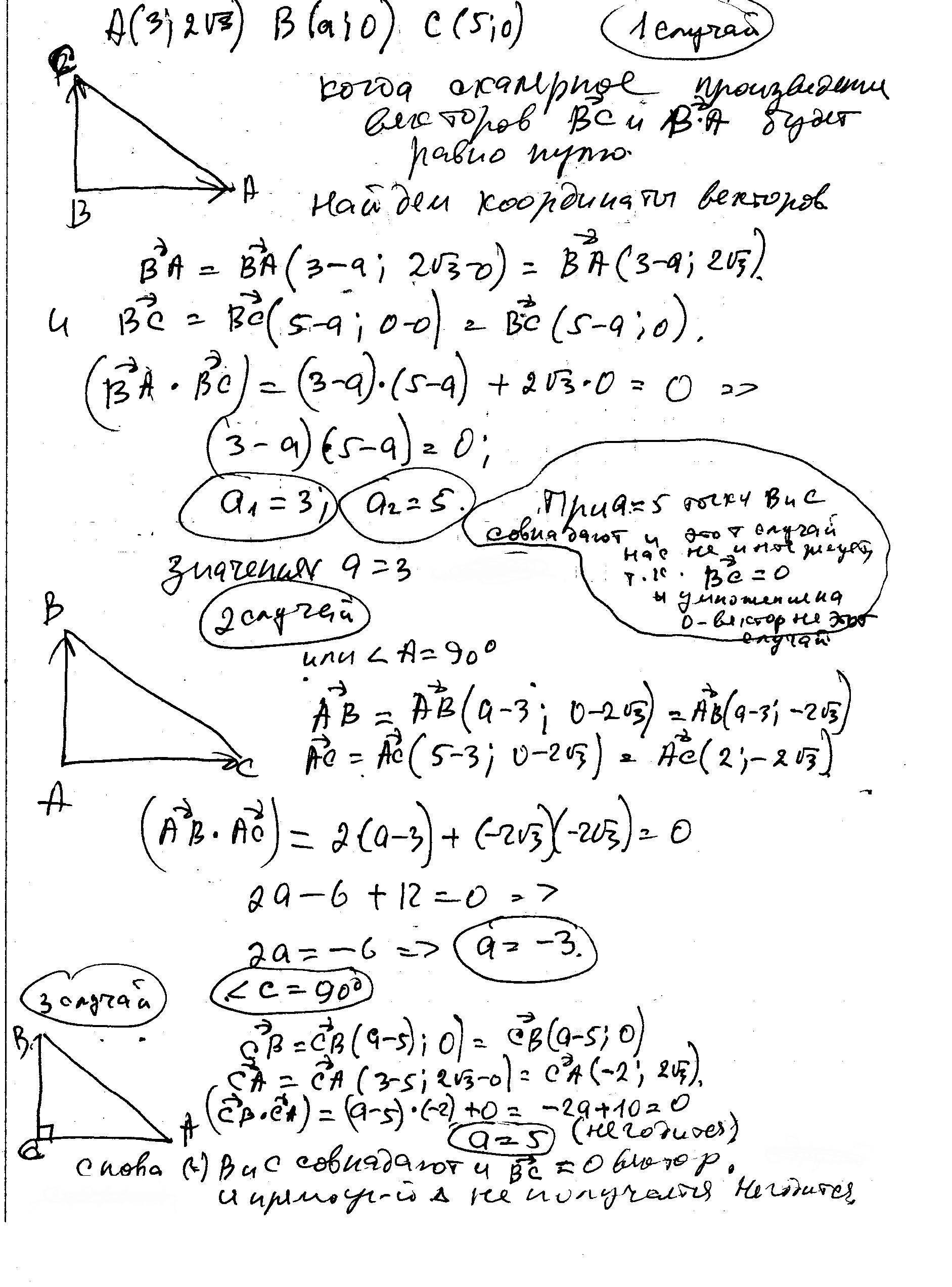 А(3;2 корень из 3);В(а;0);С(5;0).При каком значении а точки А,В и С будут являться вершинами прямоугольного треугольника.