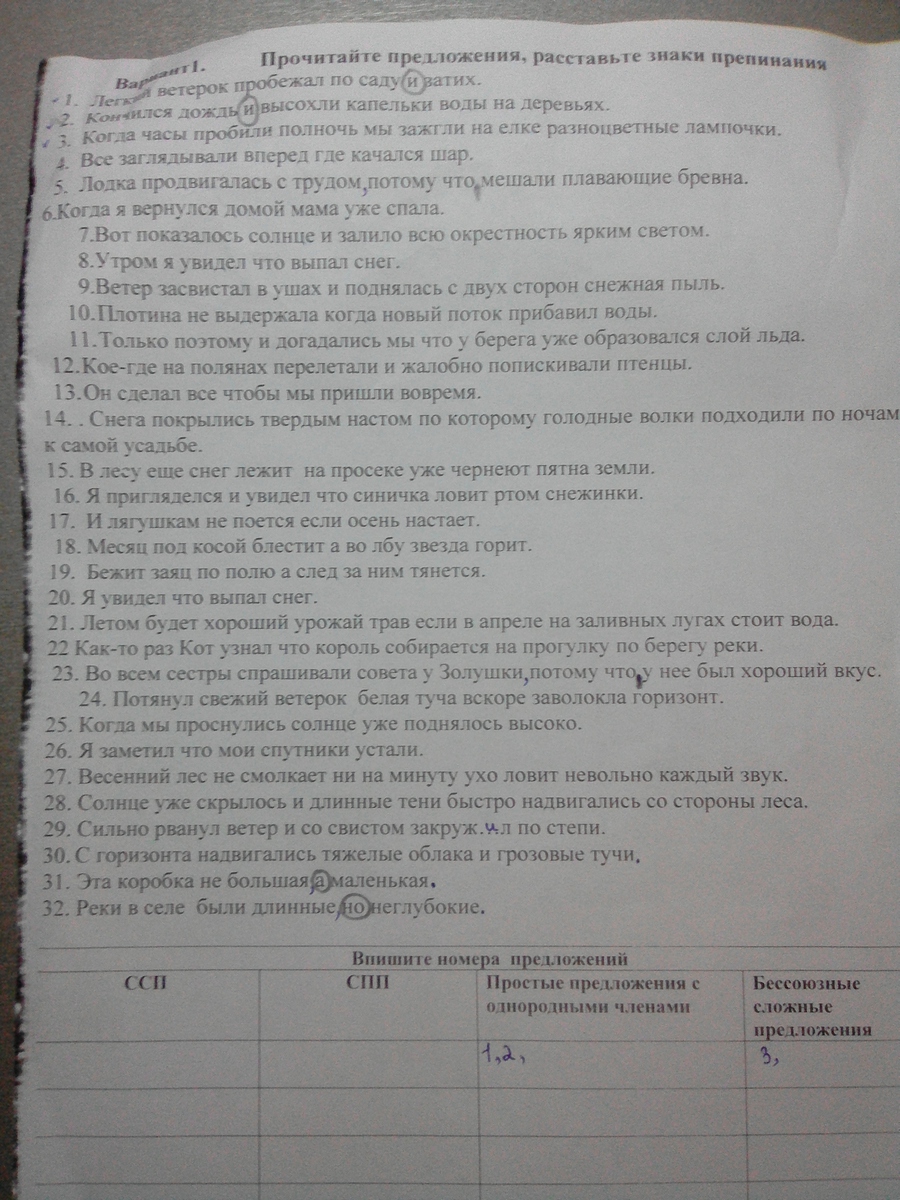 1. Лёгкий ветерок пробежал по саду и затих. 2. Кончился дождь, и высохли капельки воды на деревьях. 3. Когда часы забили полночь, мы зажгли на ёлке разноцветные лампочки. 4. Все заглядывали вперёд, где качался шар. 5. Лодка продвигалась с трудом, потому что мешали плавающие брёвна. 6. Когда я вернулся домой, мама уже спала. 7. Вот показалось солнце и залило всю окрестность ярким светом. 8. Утром я увидел, что выпал снег. 9. Ветер засвистел в ушах, и поднялась с двух сторон снежная пыль. 10. Плотина не выдержала, когда новый поток прибавил воды. 11. Только поэтому и догадывались мы, что у берега уже образовался новый слой льда. 12. Кое-где на полянах перелетали и жалобно попискивали птенцы. 13. Он сделал всё, чтобы мы пришли вовремя. 14. Снега покрылись твёрдым настом, по которому голодные волки подходили по ночам к самой усадьбе. 15. В лесу ещё снег лежит, на просеке уже чернеют пятна земли. 16. Я пригляделся и увидел, что синичка ловит ртом снежинки. 17. И лягушкам не поётся, если осень настаёт. 18. Месяц под косой блестит, а во лбу звезда горит. 19. Бежит заяц по полю, а след за ним тянется. 20. Я увидел, что выпал снег. 21. Летом будет хороший урожай трав, если в апреле на заливных лугах стоит вода. 22. Как-то раз Кот узнал, что король собирается на прогулку по берегу реки. 23. Во всём сёстры спрашивали совета у Золушки, потому что у неё был хороший вкус. 24. Потянул свежий ветерок, белая туча вскоре заволокла горизонт. 25. Когда мы проснулись, солнце уже поднялось высоко. 26. Я заметил, что мои спутники устали. 27. Весенний лес не замолкает ни на минуту, ухо невольно ловит каждый звук. 28. Солнце уже скрылось, и длинные тени быстро надвигались со стороны леса. 29. Сильно рванул ветер и со свистом закружил по степи. 30. С горизонта надвигались тяжёлые облака и грозовые тучи. 31. Эта коробка не большая, а маленькая. 32. Реке в селе были длинные, но неглубокие.