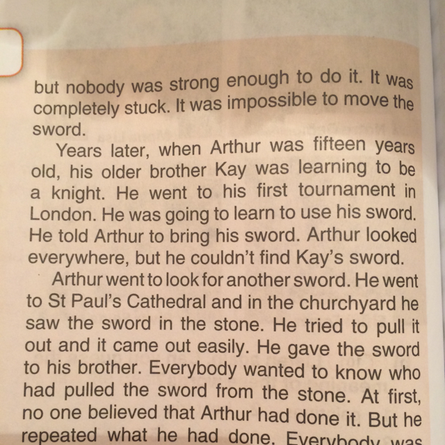 Годами позже, когда Артуру исполнилось 15 лет, его старший брат Кей готовился стать рыцарем. Он приехал на его первый турнир в Лондон. Он собирался обучится как работать с мечом. Кей сказал Артуру принести его меч. Артур искал везде, но никак не мог найти меч Кея.