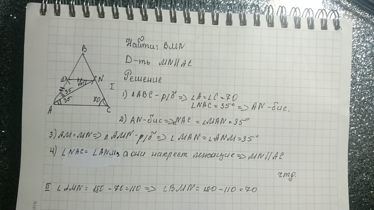 в равнобедренном треугольнике АВС с основанием ас угол С=70,AM=NM,/уголCAN=35градусам. Докажите что MN//AC.Найдите угол BMN.Запишите решение и ответ