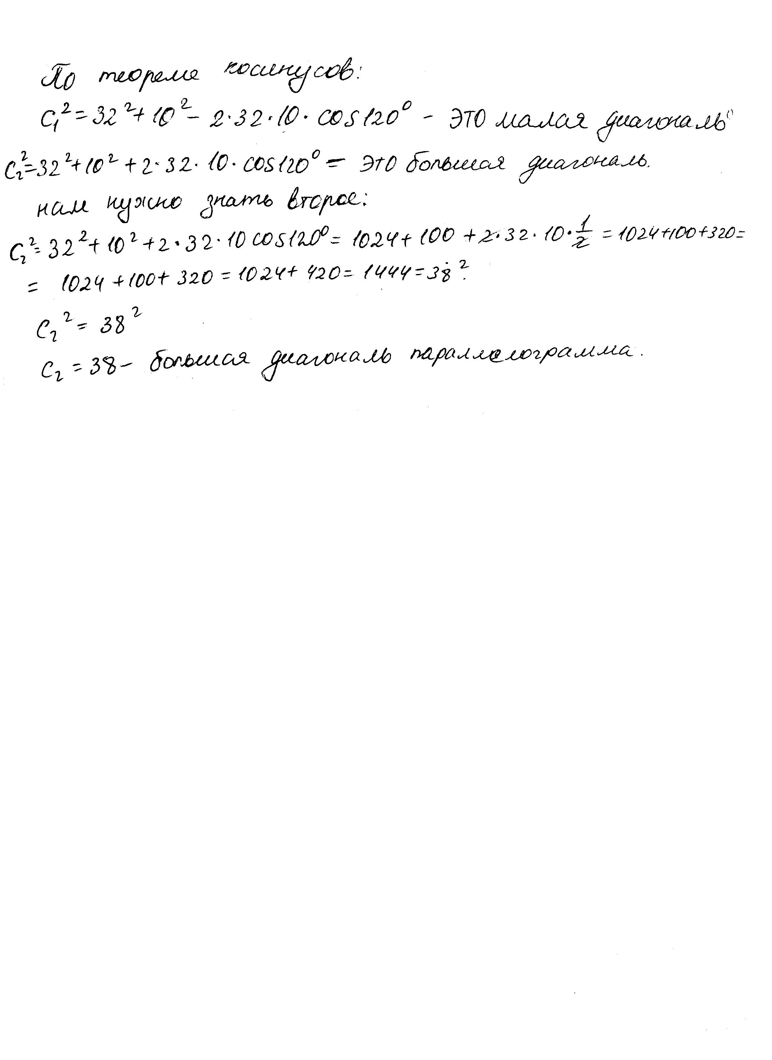 диагонали параллелограмма равны 32 и 10 см ,а угол между ними - 120° .Найдите большую сторону параллелограмма